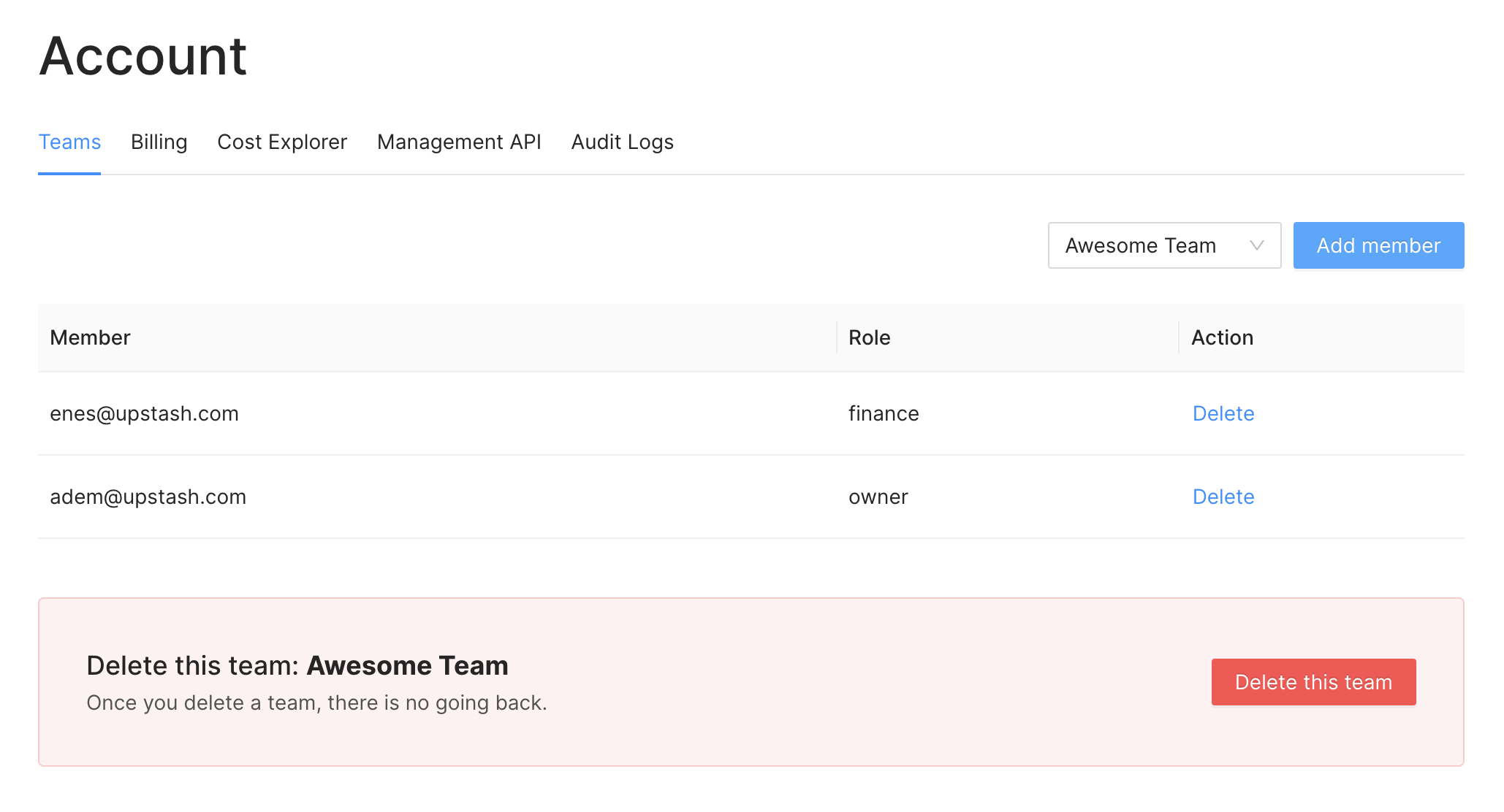 Once you switched to a team, you can add team members inAccount > Teams if